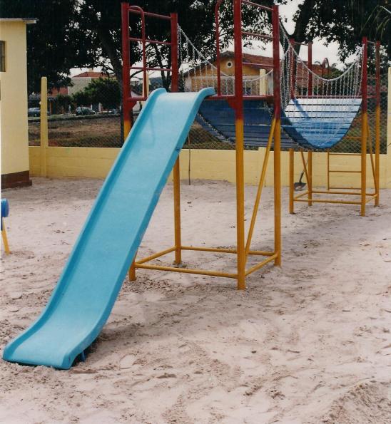 Material: Estrutura em aço, assoalho da ponte em madeira, sendo a prancha do escorregador em fibra de vidro. Utilizamos correntes galvanizadas e soldagem MIG
